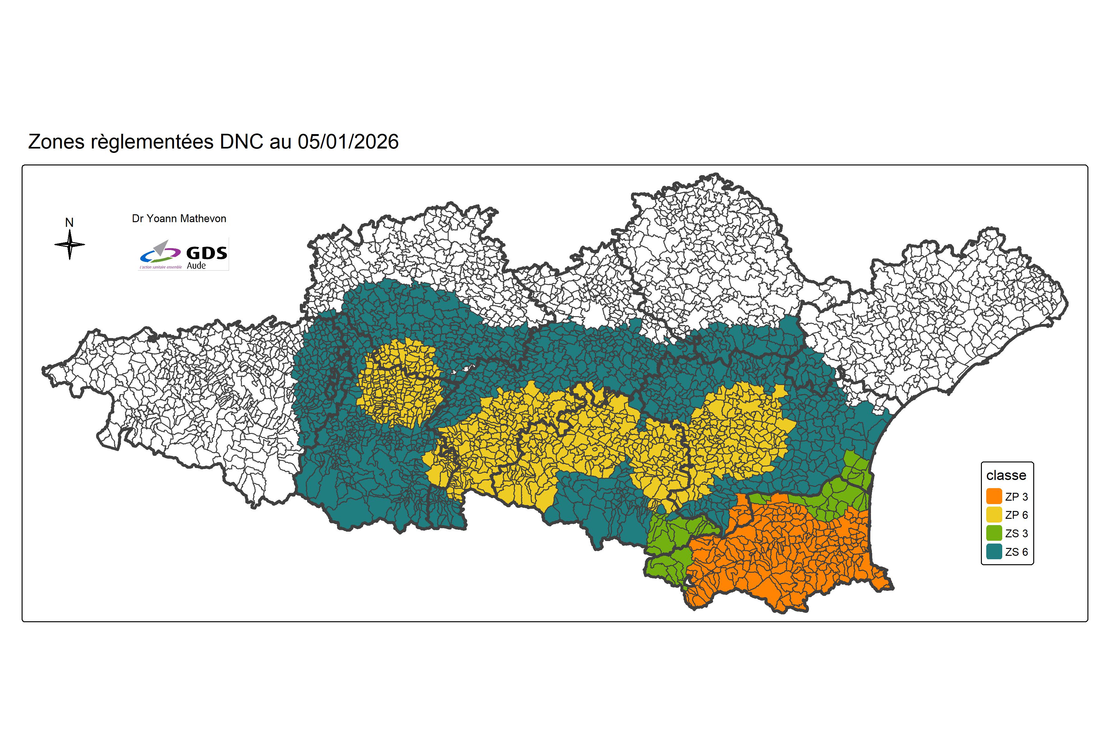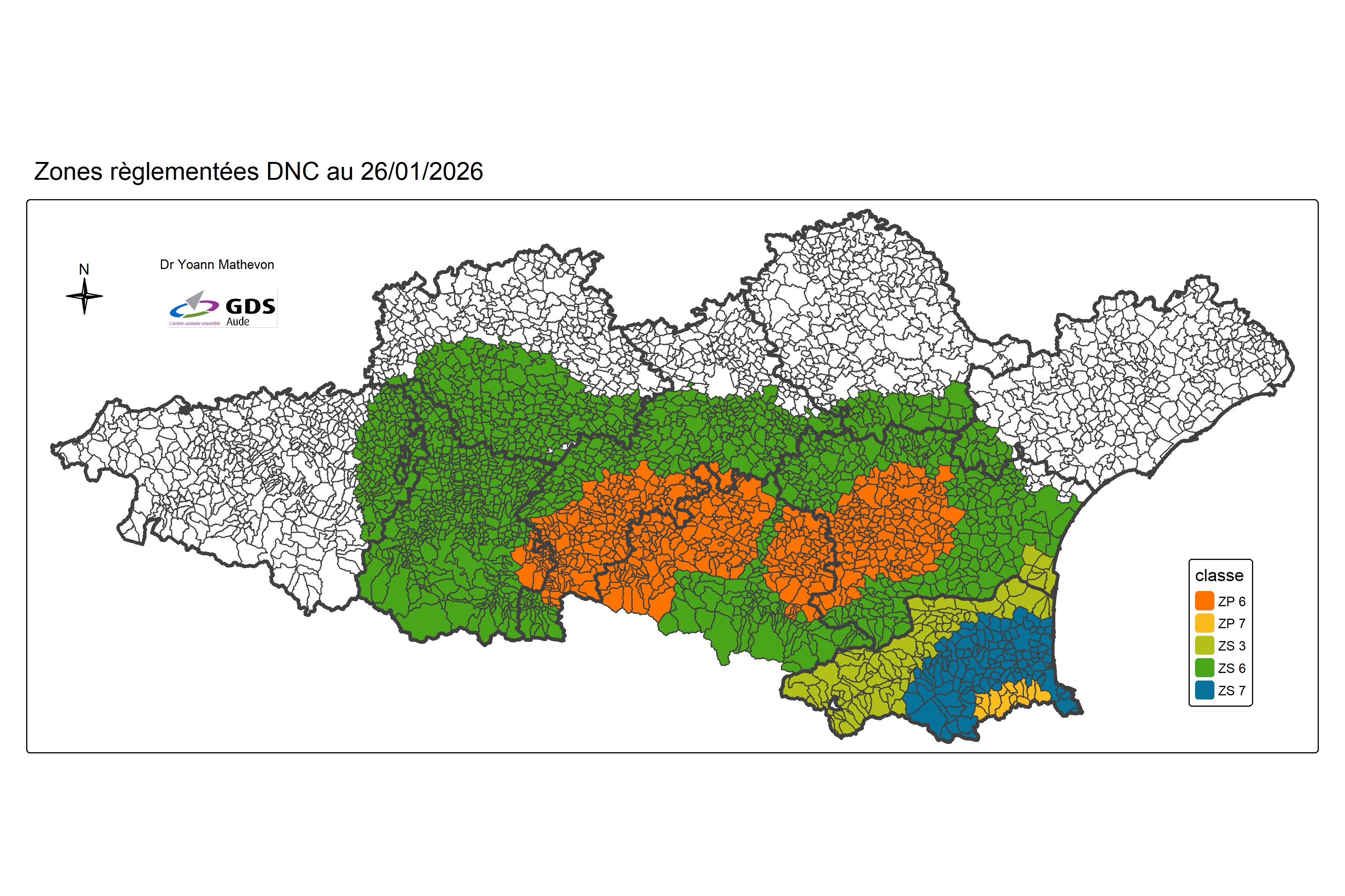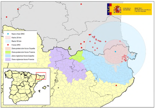 22 janvier 2026 : La confirmation d’un foyer en Espagne le 8 janvier 2026 dans la province de Gérone a entraîné la mise place d’une zone réglementée 7 constituée d’une ZP (zone de protection) et d’une ZS (zone de surveillance) dans le département des Pyrénées-Orientales (66).