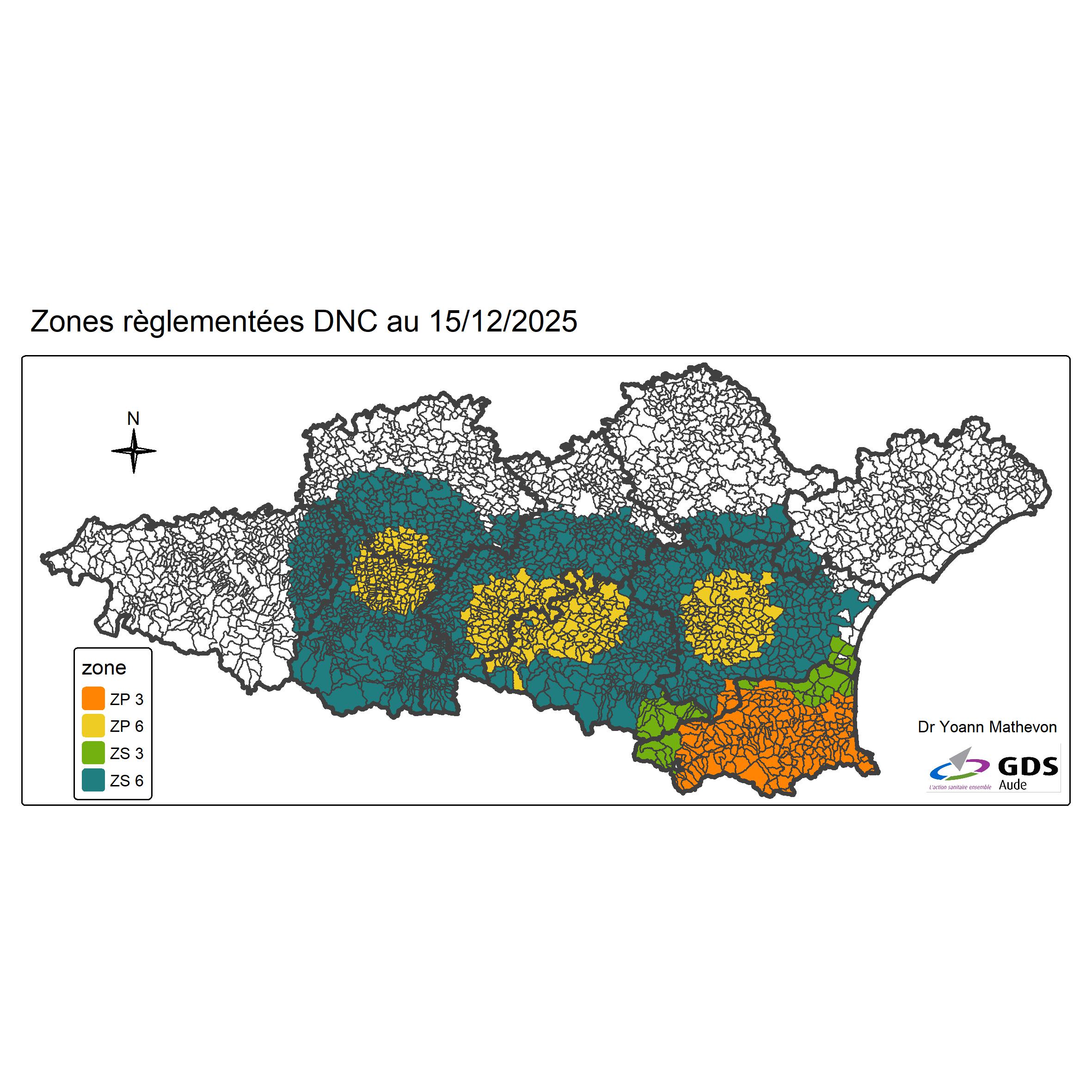 16 octobre 2025. La confirmation de 3 foyers dans les Pyrénées-Orientales (66) induit la mise en place d’une zone de protection dans le département des Pyrénées-Orientales ainsi que d’une zone de surveillance dans les Pyrénées-Orientales (66), l’Aude (11) et l’Ariège (09).