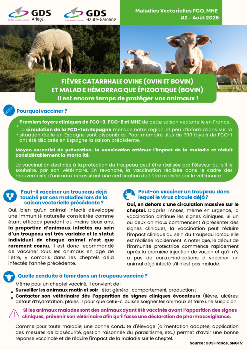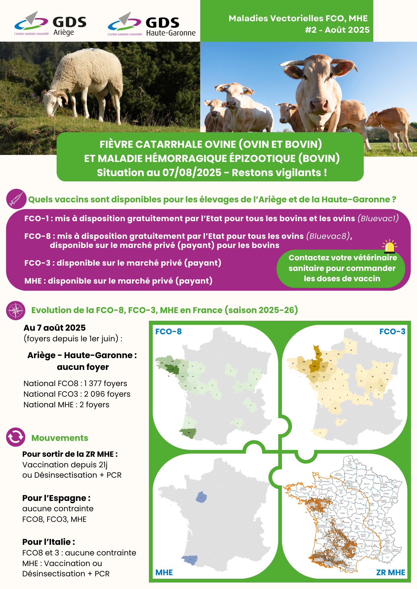 Accueil > GDS et Sections d’espèce > GDS de l’Ariège > Actualités > DNC, FCO, MHE situation au 7 août 2025