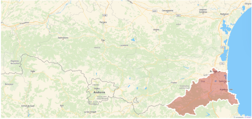 La zone de surveillance intersecte le département français des Pyrénées-Orientales mais pas la zone de protection (cf. figure) (Source : communiqué de presse MASA du 04/10/2025).