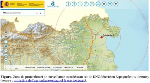 Un foyer de dermatose nodulaire contagieuse bovine (DNC) a été détecté en Espagne à 20 km de la frontière française, le 01/10/2025, dans un élevage de 123 bovins. Une zone de surveillance a été mise en place sur le territoire français.