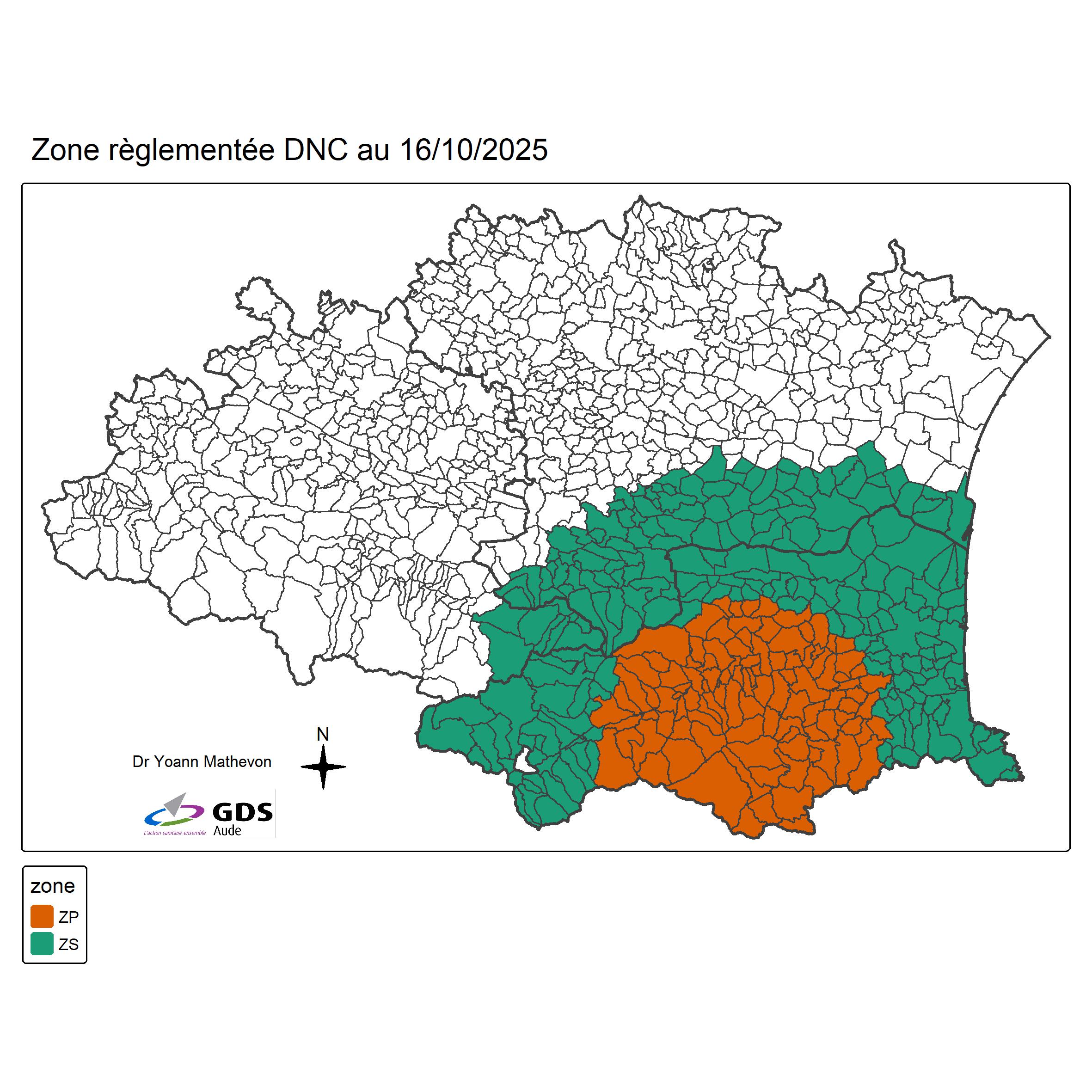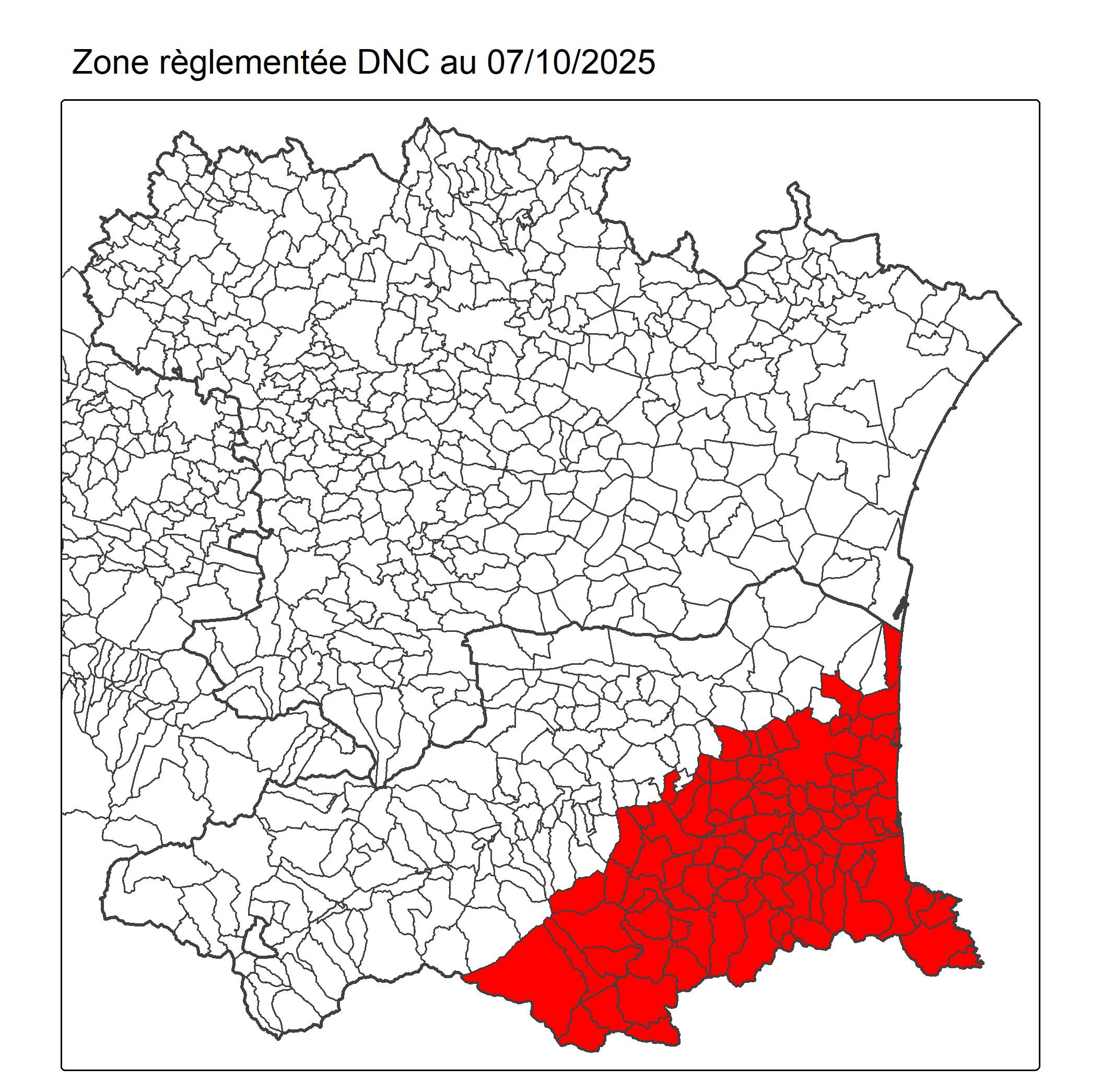 Suite à la découverte de trois foyers DNC dans les PO voici la carte de la zone règlementée au 16/10/2025 :