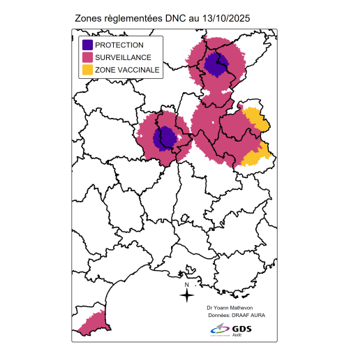 le 11/10/2025, un foyer à été découvert dans le Doubs menant à une quatrième zone règlementée en France. Cette zone ne déborde pas sur les autres zones règlementée.