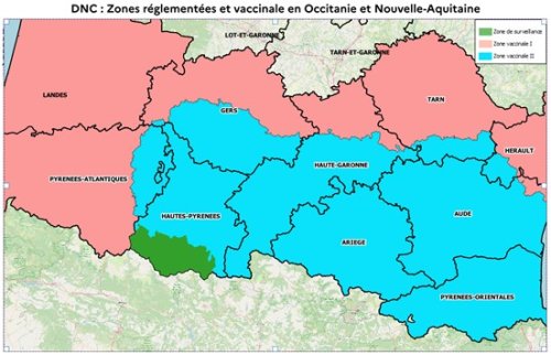 Le 28 février, un foyer de DNC a été confirmé par les autorités espagnoles, dans un élevage non vacciné, bien qu’en zone de vaccination. Le zonage autour de ce foyer englobe une partie du département des Hautes-Pyrénées, dont 26 communes passent en zone de surveillance.