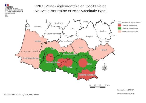 Depuis le 9 décembre, 4 nouveaux foyers ont été confirmés dans 4 départements d’Occitanie : en Ariège, dans les Hautes-Pyrénées, en Haute-Garonne et dans l’Aude, ce qui a induit la mise en place d’une nouvelle zone réglementée (ZR6) avec une zone vaccinale (ZV1) étendue, notamment à la totalité du Tarn et de l’Hérault.