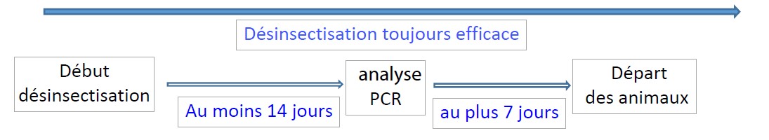 – les bovins peuvent sortir de la zone après application d’un insecticide 14 jours au moins avant leur départ ; et après réalisation d’un prélèvement sanguin au moins 14 jours après la désinsectisation de l’animal attestant que l’animal n’est pas porteur du virus et au maximum dans les 14 jours avant le départ
