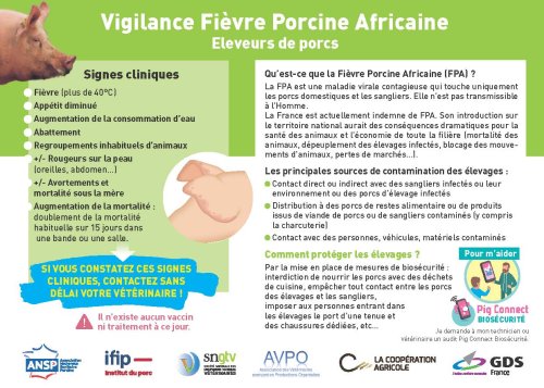 • Pour tous : relayer selon vos publics cibles les supports de communication (sensibilisation, vigilance, bonnes pratiques) disponibles sur le site du ministre de l’agriculture : https://agriculture.gouv.fr/peste-porcine-africaine-le-kit-de-communication