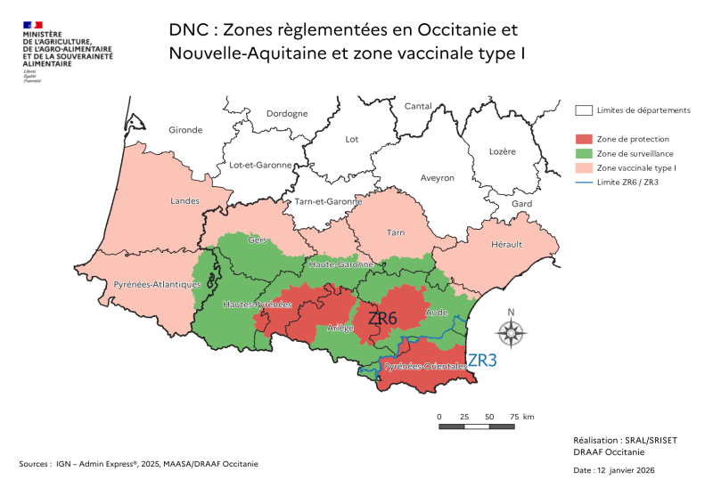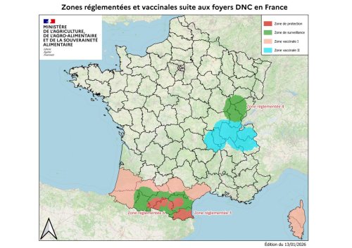 12 janvier 2026 : Levée de la zone protection mise en place autour de la localisation du foyer du département 65, le foyer étant assaini depuis 28 jours et les surveillances vétérinaires réalisées dans le cadre des opérations de vaccination étant favorables.