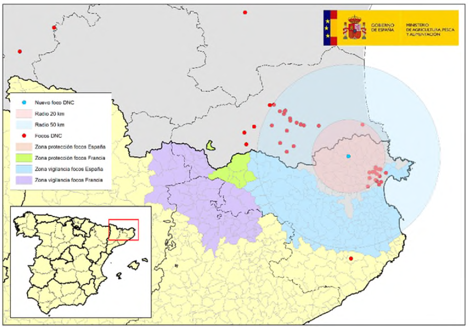 Le ministère de l’agriculture espagnol à annoncé la découverte d’un foyer le 07/01/2026 à la frontière des Pyrénées Orientales. Il s’agit d’un cas sur un élevage allaitant extensif pour lequel quelques animaux n’avaient pu être vaccinés à l’automne 2025. Le nombre de foyers de DNC en Espagne est donc de 18.